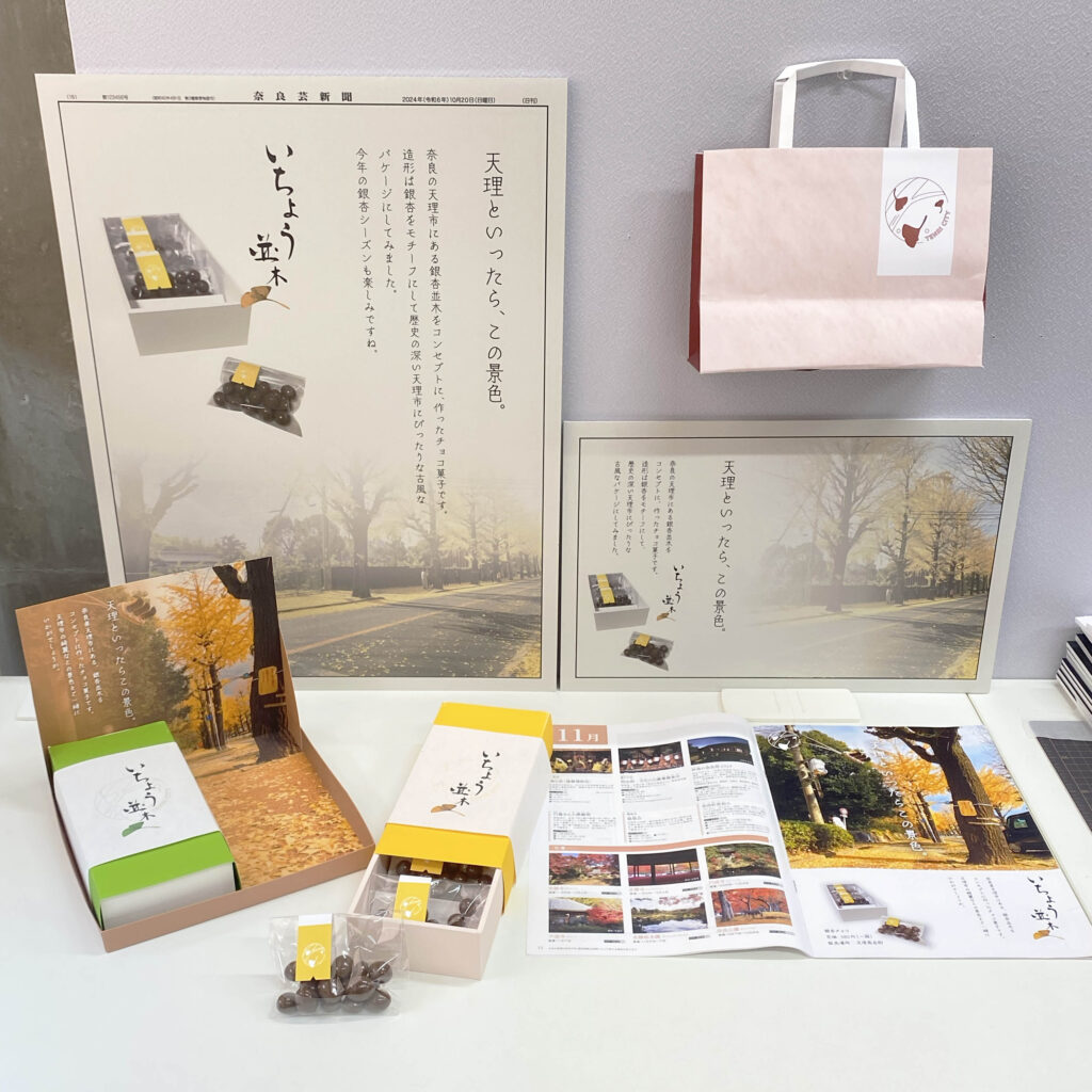 奈良県の天理市にある、綺麗な銀杏並木をモチーフにチョコ菓子とそのパッケージのデザインをしました。ショッパーや新聞広告など、幅広い展開をして本格的に仕上げれました。