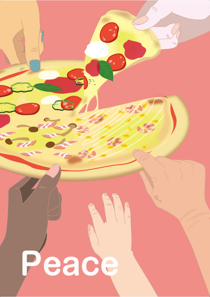 Peacaをテーマに作成したポスターです。私はPeaceという言葉からみんなで分け合う平和を想像したのでこのデザインにしました。