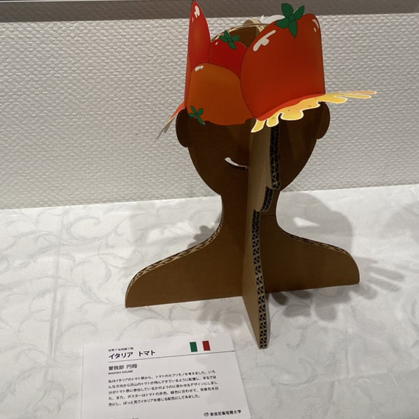 好きな国を選んでそこの土地で有名なものをモチーフに、被り物を作るという物です。私はイタリアのトマト祭より、トマトをモチーフに被り物のデザインをしました。